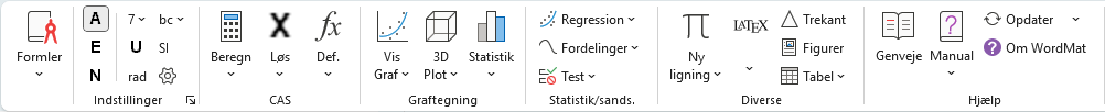 WordMat er et tilføjelsesprogram til Word. Når det er installeret vil der være en ekstra fane i Word, der gør det muligt at foretage matematiske beregninger direkte i Word. WordMat er målrettet det danske gymnasium, men kan sagtens anvendes fra grundskolen og på videre uddannelser. Installer-pakken du kan hente på dette websted er gratis for elever, studerende, lærer og private. Se her for WordMat licens